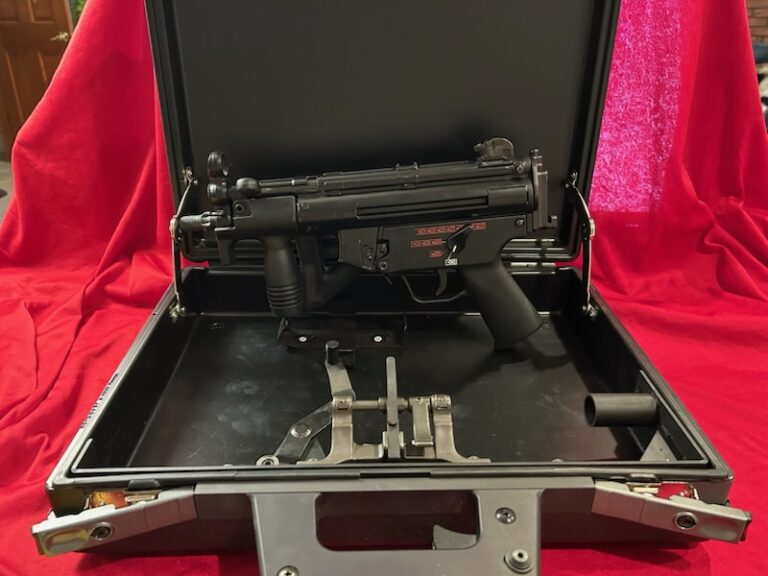 INQUIRE HK MP5K: Fleming Arms registered Heckler & Koch AUTO SEAR in 4 position configuration in H&K host gun. The Fleming Registered Transferable Sear is the most coveted and highly sought-after of all the registered HK Sears. This sear enables select-fire capability in compatible firearms, allowing both semi-automatic and fully automatic firing modes. INCLUDES: This is an original German HK Operational Briefcase. This Briefcase is completely New in exceptional condition, and comes as shown. The original German Heckler & Koch MP5K operational briefcase is a specialized covert carrying system designed for discreet transport and rapid deployment of the compact MP5K submachine gun. Developed for law enforcement, security personnel, and special operations units, the briefcase allows the operator to fire the weapon while it remains concealed within. THIS IS AN AS NEW GUN. Call 570-592-2171 for details.